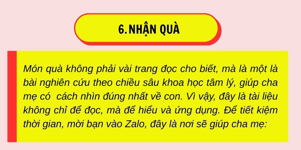 Chính khoảnh khắc này mới cho thấy bạn là cha mẹ yêu con minh triết. Và đó là bước đầu tiên của mọi hành trình giáo dục đúng. Món quà bạn sắp nhận là kết quả nghiên cứu trong lĩnh vực Giáo dục – Tâm lý – Khoa học thuộc trường phái Giáo dục từ Gốc.