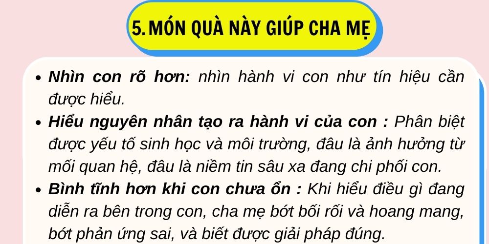 Đây là nơi bạn và con được bắt đầu lại từ Gốc của chính mình. Vì chỉ khi được hiểu, con mới học tập tốt và trưởng thành. Và chỉ khi cha mẹ dừng lại để lắng nghe, gia đình mới trở thành mái nhà bình an cho mọi người. Món quà này là khởi đầu cho hành trình hạnh phúc ấy.